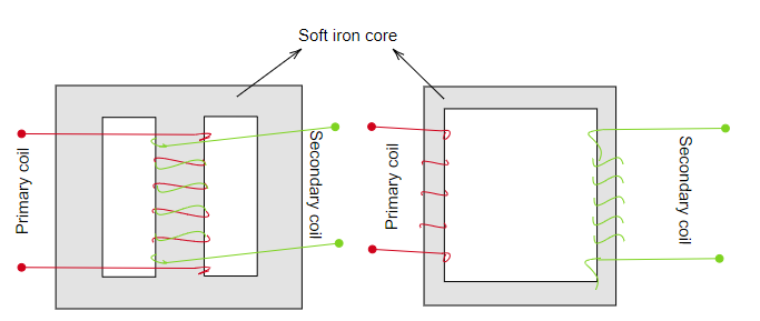 * The parts of the transformer are the primary coil and the secondary coil which is wound on a soft iron core and insulated from each other. They are either wounded on top of the other or on separate limbs of the soft iron core or magnetic core.
