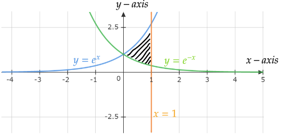 Hint: In this question, we are given the equation of the curves $y = {e^x}$, $y = {e^{ - x}}$ and the line i.e., $x = 1$. We have to find the area bounded by them. Firsly, plot the graph of the given equations of curve and the line. Then, see the point of intersection of both the curves. To calculate the area, integrate the difference of first curve and the second curve with respect to $dx$ from $0$ to $1$. Solve it further using the integration formula of the exponential function.