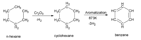 In the process of aromatization of n-hexane, the n-hexane at first is treated with vanadium oxide or chromium (III) oxide. This treatment gives a cyclic hexane or cyclohexane. This cyclohexane formed in the first step then undergoes dehydrogenation and aromatization to give benzene as the final product. The reaction of aromatization of n – hexane to give benzene is shown below: