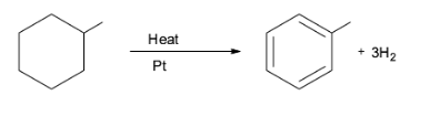 Note: The aromatization reaction has a huge application in the oil refining process. For example, it is observed in the conversion of naphthene into aromatics which is catalyzed by platinum. This is illustrated in the conversion of methylcyclohexane into toluene. This reaction is used in the production of gasoline from petroleum.