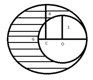 As shown in figure, when a spherical cavity ( Centered at $0$ ) of radius $1$ is cut of a uniform sphere of radius $'R'$ ( Centered at $C$ ), the center of mass of the remaining (shaded) part of the sphere is at $G$ i.e. on the surface of the cavity. $R$ can be determined by the equation.