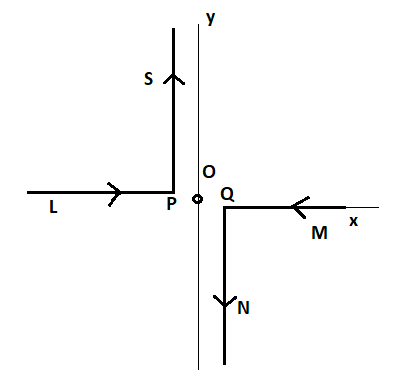 As shown in the figure, two infinitely long, identical wires are bent by ${90^ \circ }$ and placed in such a way that the segments $LP$ and $QM$ are along the x-axis, while segments $PS$ and $QN$ are parallel to the y-axis, if $OP = OQ = 4cm$, and the magnitude of the magnetic field at $O$ is \[{10^{ - 4}}T\], and the two wires carry equal currents (see figure), the magnitude of the current wire and the direction of the magnetic field at $O$ will be (${\mu _0} = 4\pi {10^{ - 7}}N{A^{ - 2}}$)