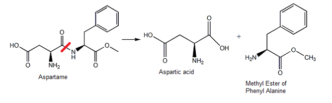 As you have seen in the above reaction if we break carbon-nitrogen bond we get two compounds. One is Aspartic acid and another will be Methyl ester of Phenylalanine. Here, we are obtaining Methyl ester of Phenylalanine because Phenyl-alanine moiety is present in Aspartame as its methyl ester form.