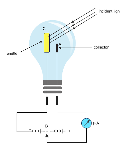It comprises evacuated glass or quartz bulbs with an anode and cathode made of two metallic electrodes. Anode A is a thin rod or wire held along the axis of semi-cylindrical cathode C, which is semicircular in shape and coated with photosensitive material. Through the galvanometer, the potential difference is applied between cathode and anode.