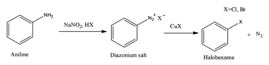 Option B is the Sandmeyer reaction. A chemical reaction that produces aryl halides from aryl diazonium salts using copper salts as catalyst is termed as Sandmeyer's reaction. This reaction is used in transformation of benzene like trifluoromethylation, cyanation etc.