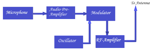 Note: The radio frequency (RF) amplifier picks up the radio waves or signals and sends them to the mixer, which then sends the signal or waves to the filter, where the required frequency of the wave or signal is separated and given to the demodulator, where it is transformed into audio data.