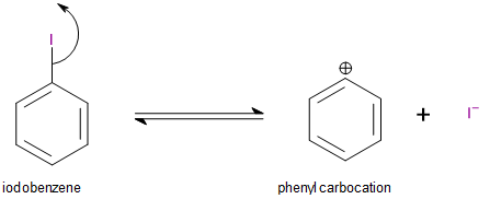 This process does not occur in the case of iodobenzene because the carbocation formed in this case is an unstable phenyl carbocation. It is unstable because the positive charge exists on a doubly bonded, \[s{p^2}\]hybridised carbon. Carbocations become stabilised when they are attached to groups that can donate an electron pair into their empty p-orbitals. In the case of phenyl carbocation, the\[s{p^2}\]nature of the positively charged carbon atom prevents it from donating an electron pair and stabilising the carbocation.