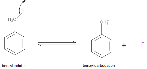 The first step involves the iodine atom leaving the molecule as an iodide ion (\[{I^ - }\]) leaving behind a benzyl carbocation as shown below: