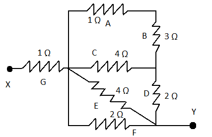 Given, ${R_A} = 1\Omega $, ${R_B} = 3\Omega $, ${R_C} = 4\Omega $, ${R_D} = 2\Omega $, ${R_E} = 4\Omega $, ${R_F} = 2\Omega $ and ${R_G} = 1\Omega $.