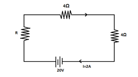 Since the resistors are connected in series the total equivalent resistance of the circuit will be the sum of individual resistances of the circuit. It is given that the other two resistors of the circuit have a resistance of $4\Omega $ each. Hence we can write the equivalent resistance of the circuit as,