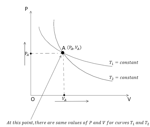 Clearly, from the above graph it can be observed that if the two isothermal curves intersect at point A, there will be the same values of pressure and volume i.e., ${P_A}$ and ${V_A}$ at that point. That’s why if the two curves intersect, the volume and pressure of the gas will be the same at two distinct isothermal temperatures, which is not possible. As a result, two isothermal curves can ‘Never’ intersect.