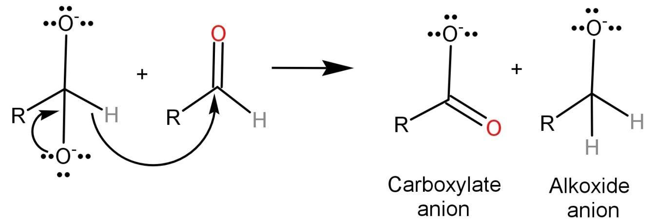 Step-1: In this step, the carbonyl group of the aldehyde is attacked by a nucleophile (like the hydroxide ion ($O{H^ - }$)) causing a disproportionation reaction which leads to the formation of an anion which has two negative charges.
