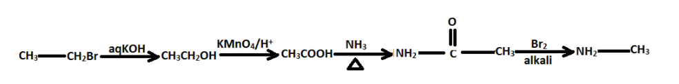 $C{H_3}C{H_2}Br\xrightarrow{{aqKOH}}A\xrightarrow{{KMn{O_4}/{H^ + }}}B\xrightarrow[\vartriangle ]{{N{H_3}}}C\xrightarrow[{alkali}]{{B{r_2}}}D$