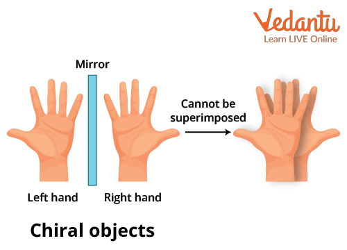 Example 1: Human hand is the best example of chirality. The left hand is a non-superimposable mirror image of the right hand and vice versa. When the right hand is placed on the left hand or the other way round, they do not superimpose. It is impossible for them to coincide with one another irrespective of their orientation.