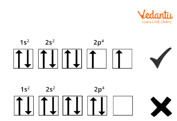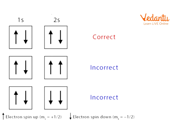 The above image shows that according to this principle the electrons must have a different spin and they must occupy the same orbitals.