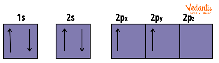 Electronic Configuration: $1 s^{2}\, 2 s^{2}\, 2 p_{x}^{2}\, 2 p_{y}^{1}\, 2 p_{z}^{1}$