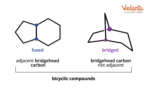 For clarity, the fused and bridged types in bicyclics have distinct connectivity. Fused has the rings joined directly, and bridged includes an extra chain (bridge) between the ring junctions.