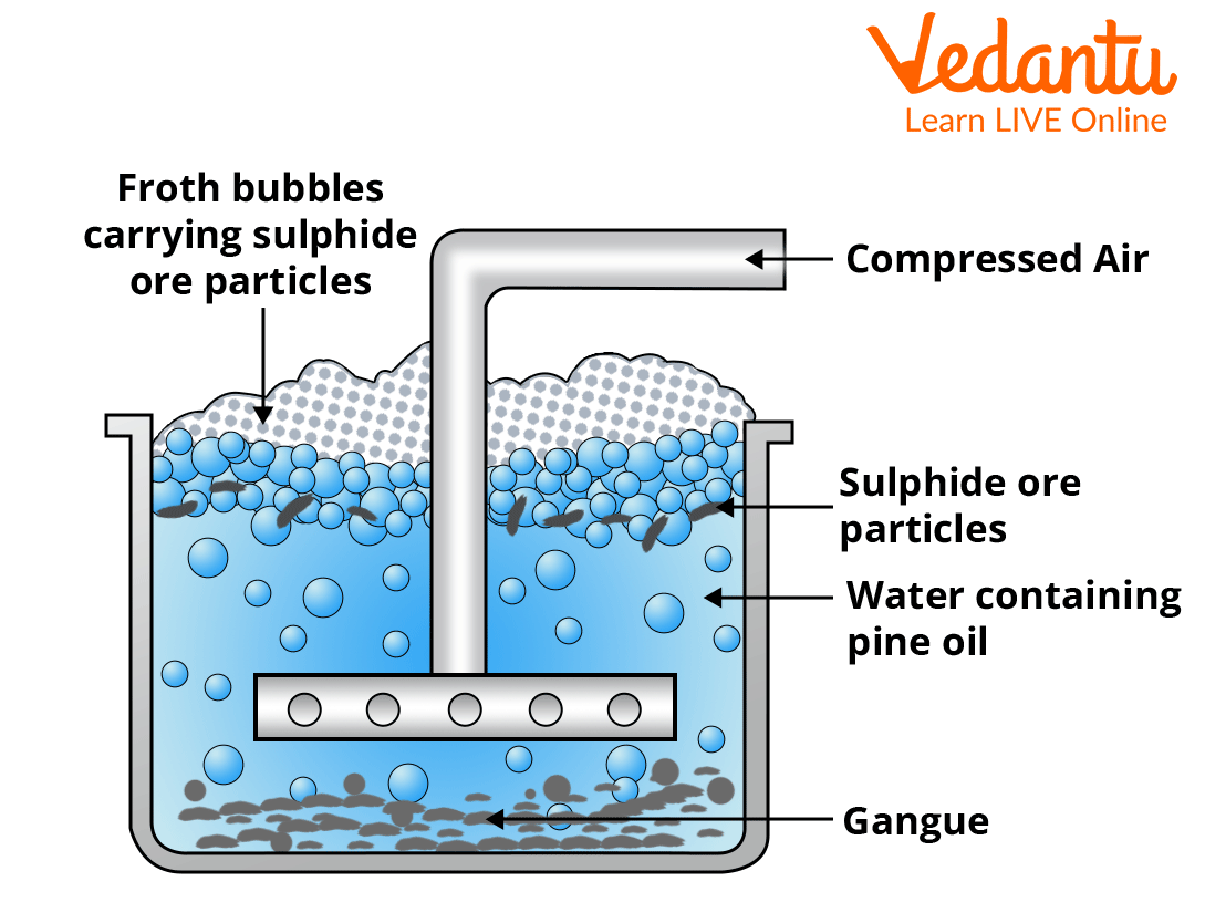 This method is commonly used to concentrate sulphide ores such as zinc blende (ZnS), copper pyrites (CuFeS2) and others. The surface of sulphide ores is preferentially wetted by oils, whereas the surface of gangue is preferentially wetted by water.