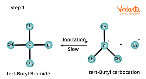 This rate law implies that the reaction takes two steps. Tert-butyl bromide is ionized in the first step, yielding tert-butyl carbocation and a bromide ion.