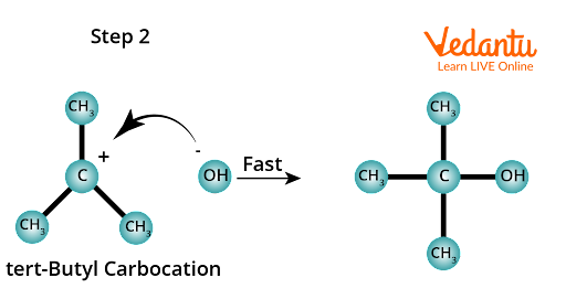 In the second step, the carbocation, being a reactive chemical species, is immediately attacked by the nucleophile, OH- ion, yielding the substitution product, tert-butyl alcohol. This step is quick and thus does not affect the rate of the reaction.