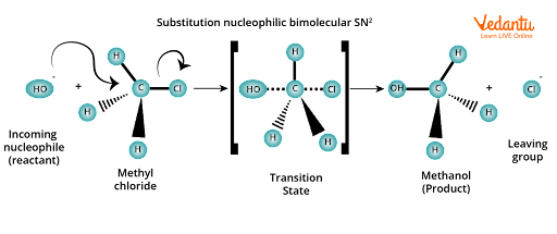 In the transition state, the carbon atom is simultaneously bonded to the incoming nucleophile (OH- ion) and the outgoing leaving group (Cl- ion). In other words, because carbon atoms are bonded to five atoms in the transition state, the transition state is unstable and thus cannot be isolated. Due to its instability, it eventually decomposes to form the product methanol and the leaving group (Cl- ion).