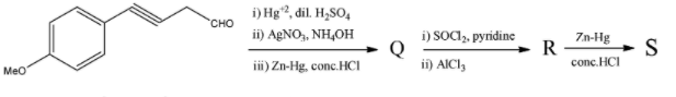 Note: Remember that in the very first reaction that includes the Markovnikov’s rule some product that has the ketonic group at the other end of the triple bond will also be formed but we are only considering major products. Even if we do consider the minor product, we will eventually get the same structures for Q, R, and S.
