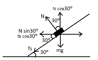 \[N\cos {30^0} = mg + {f_s}\sin {30^0}\]
