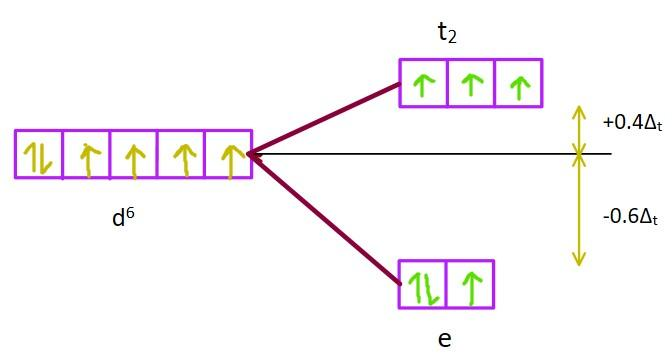 In this case, the crystal field stabilization energy (CFSE) is calculated as \[CFS{E_t} = 3 \times ( - 0.6{\Delta _t}) + 3 \times ( + 0.4{\Delta _t}) = - 0.6{\Delta _t}\].