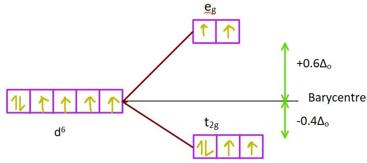 In this case, the crystal field stabilization energy (CFSE) is calculated as \[CFS{E_o} = 4 \times ( - 0.4{\Delta _o}) + 2 \times ( + 0.6{\Delta _o}) = - 0.4{\Delta _o}\]
