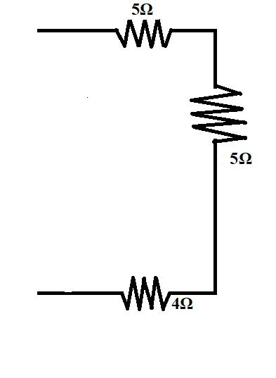 The equivalent resistance of the circuit, $R = 5\Omega + 5\Omega + 4\Omega = 14\Omega $