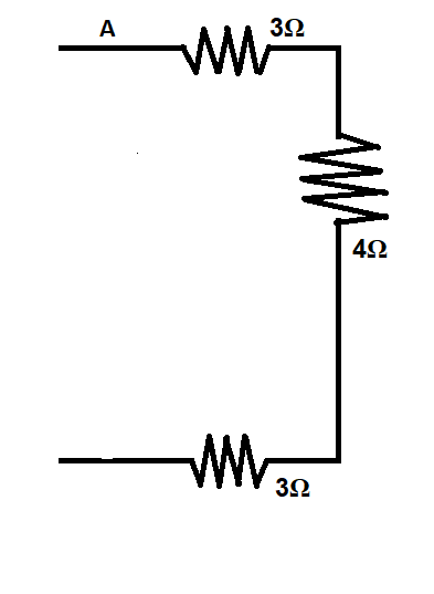 The three resistors $3\Omega, 4\Omega$ & $3\Omega$ are connected in series, therefore their equivalent resistance can be written as,
