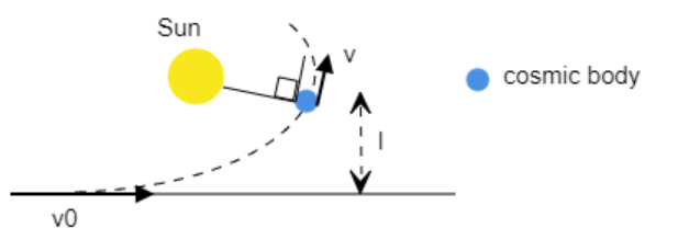 Consider the figure given below. A cosmic body C moves to the Sun with velocity ${v_0}$ (when far from the Sun) and aiming parameter $l$, the arm of the vector $\overrightarrow {{v_0}} $, relative to the centre of the Sun. Find the minimum distance by which this body will get to the Sun.