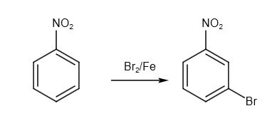Firstly, we have to do bromination of the nitrobenzene. The reagent used for the reaction is \[B{r_2}/Fe\] reagent. Here, electrophilic substitution takes place. The reaction is as follows: