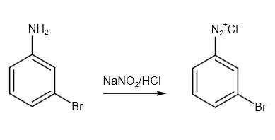After that, we have to convert it into diazonium salt. The compound reacts with sodium nitrite and HCl in cold conditions to form diazonium salt. The reaction is as follows: