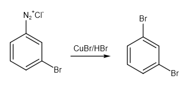 Finally, we have to use the Sandmeyer reaction to get the desired product dibromo benzene. A common substitution reaction is the Sandmeyer reaction, which is used to produce aryl halides from aryl diazonium ions. Catalysts for this process include copper salts like chloride, bromide, or iodide ions. The reaction is as follows: