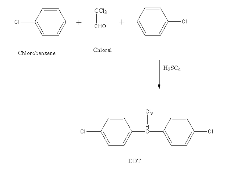 In the above reaction, two moles of chlorobenzene reacts with one mole of chloral in presence of concentrated sulphuric acid to form dichlorodiphenyltrichloroethane.