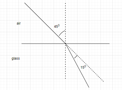 Given the angle of incidence is ${45^ \circ }$and the refracted ray is deviated by ${15^ \circ }$.