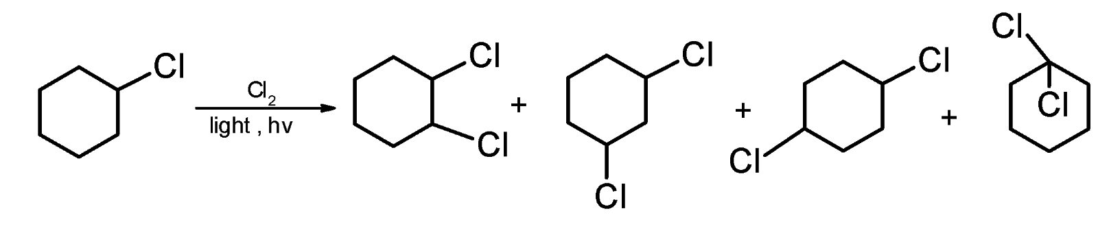 When mono substituted haloalkanes are further treated with the halogen results in the disubstituted haloalkanes. The chlorocyclohexane when treated with the excess of chlorine it is converted into the dichlorocyclohexane.