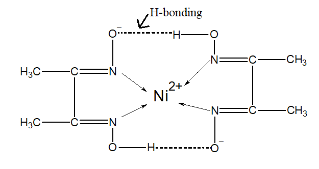 The DMG forms a complex with nickel. It is a red colour complex which is formed in the basic conditions. The nickel can acquire the eight electrons thus two dimethyl glyoximato ligands arranged around the nickel atom. The dmg ligands are stabilized by hydrogen bonding. The nickel –dmg complex is as follows: