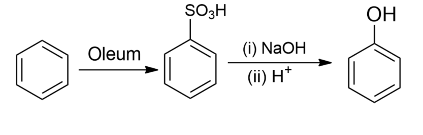 -Benzene sulphonic acid is obtained by reacting benzene with oleum. The formed benzene sulphonic acid, when treated with molten sodium hydroxide at high temperature, favours the formation of sodium phenoxide ion which on further acidification gives phenol.
