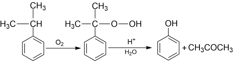 (iii) From cumene- Cumene is an organic compound produced by Friedel Crafts alkylation of benzene with propylene. Oxidation of cumene in the presence of air gives hydroperoxide which on further treatment with dilute acids gives phenol along with acetone as side by-products in large quantities. Hence phenols formed by this method need purifications.