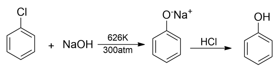 (i) From haloarenes- Chlorobenzene which is formed by the monosubstitution of the benzene ring is an example of haloarene. When chlorobenzene is fused with sodium hydroxide at 626K and 20atm, sodium phenoxide is formed which on acidification gives phenol.