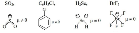 Thus the set of molecules $N{{O}_{2,}}N{{H}_{3}},POC{{l}_{3}},C{{H}_{3}}Cl$ and $S{{O}_{2}},{{C}_{6}}{{H}_{5}}Cl,{{H}_{2}}Se,Br{{F}_{5}}$ possess permanent dipole moment at room temperature.
