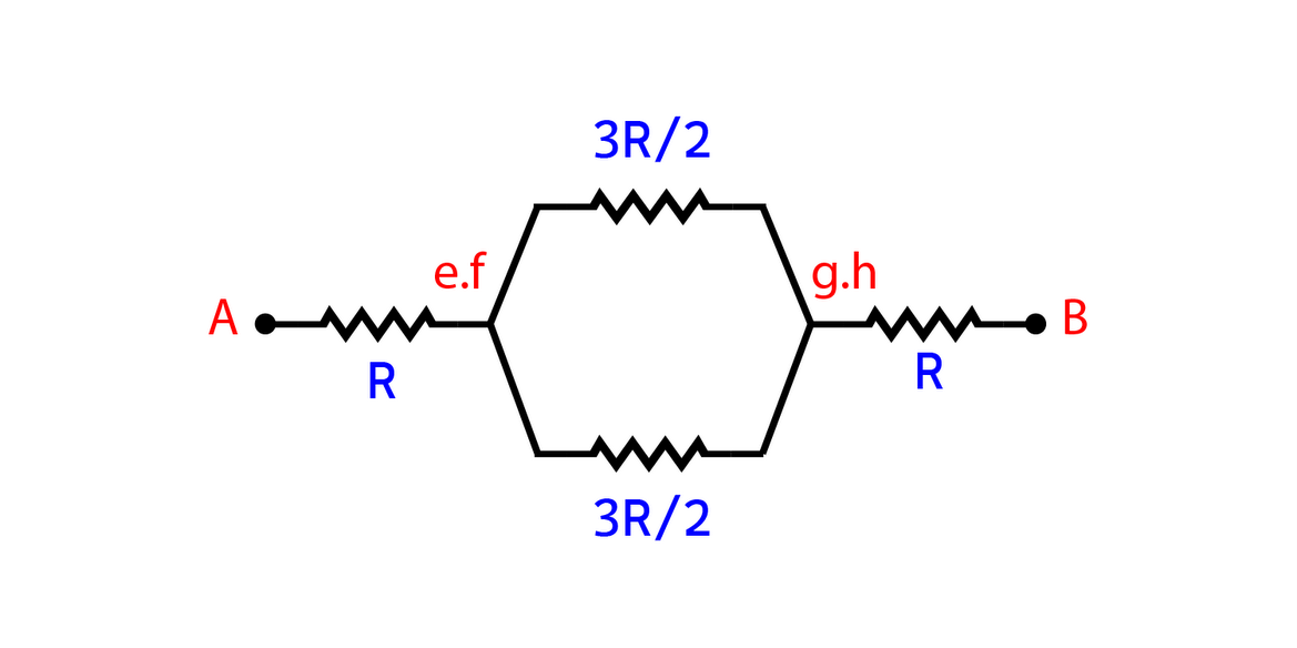 \({R_{AB}} = R + \left(\frac{1}{\frac{3R}{2}}+\frac{1}{\frac{3R}{2}}\right)^{-1}+R\)