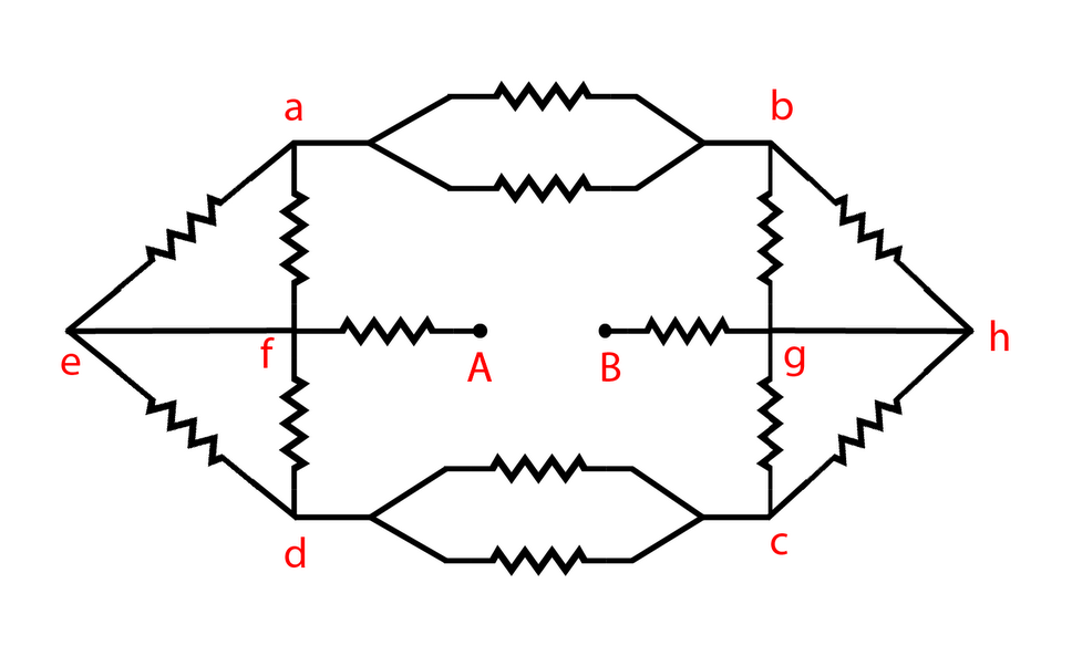 Each of the resistors shown in fig. has resistance R. Find the equivalent resistance between A and B.