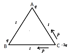 Hint: According to question, the three charges are placed on the three corners of the equilateral triangle ABC of side $l$ . Now, we know that dipole moment is always from negative charges to a positive charge. Now, assigning the charges to the corners of the triangle and marking the direction of dipole moment. Now, by resolving both moments, we will get the resultant dipole moment of the dipole moment.