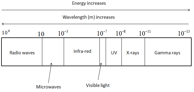 - The representation of various types of electromagnetic radiation and its relation with energy and wavelength is shown in the following figure.