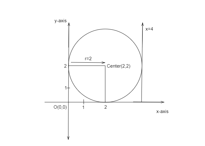 Hint: To find the equation of the circle we will use the standard form of the equation of a circle. We know that the standard form of equation of a circle is $(x-h)^{2}+(y-k)^{2}=r^{2}$ where $(h,k)$ are the coordinates of the center of the circle, $(x, y)$ are any point on the circle and $r$ is the radius of the circle. We will first draw the diagram of the circle touching line $x=4$ and $x=0,y=0$. With the help of the diagram we will derive the coordinates of the center $(h,k)$ and radius $r$. We will then substitute these values in the standard equation of the circle and then simplify to find the equation of the circle.