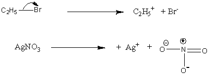 Let’s understand the reaction of ethyl iodide and silver nitrate. In the first step, dissociation of bonds of C-I and Ag-N occurs.