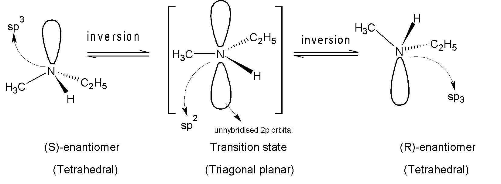 Secondary and tertiary amines with three different groups bonded to nitrogen are generally chiral compounds that can not be easily resolved at room temperature. Because nitrogen inversion or pyramidal inversion rapidly inverts the two enantiomers.